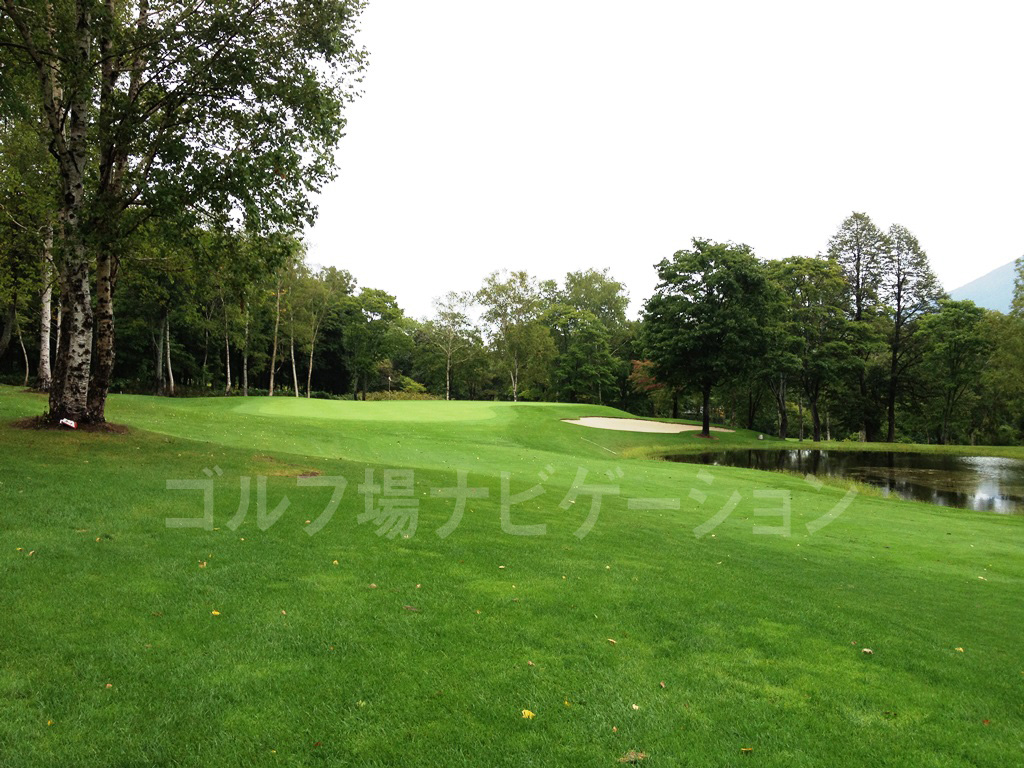 右ドッグレッグのミドルホール。2打目は打ち下し。グリーンは花道以外の3面は池に囲まれています。