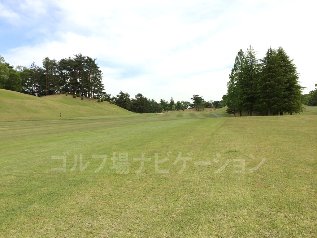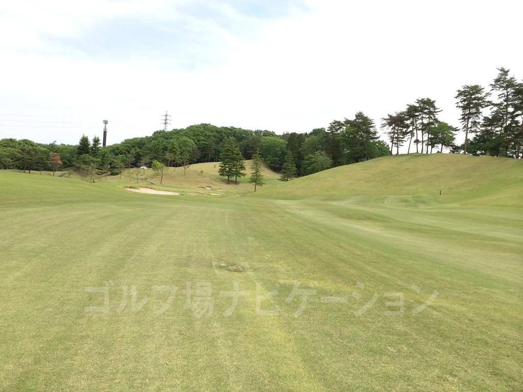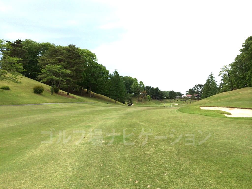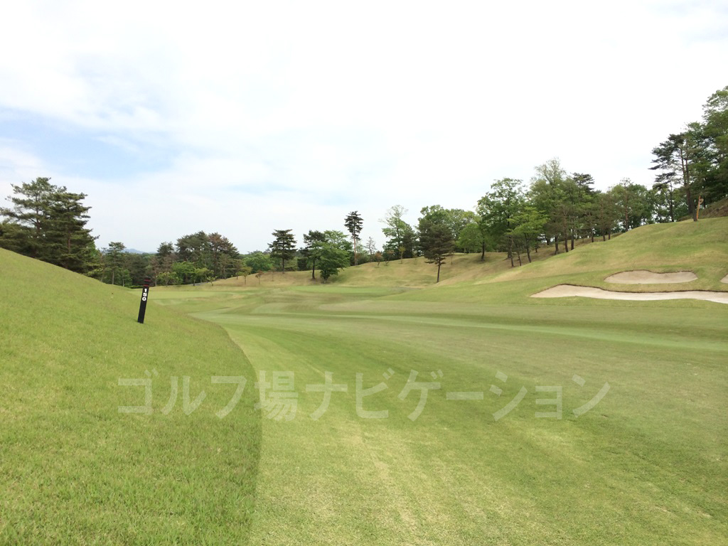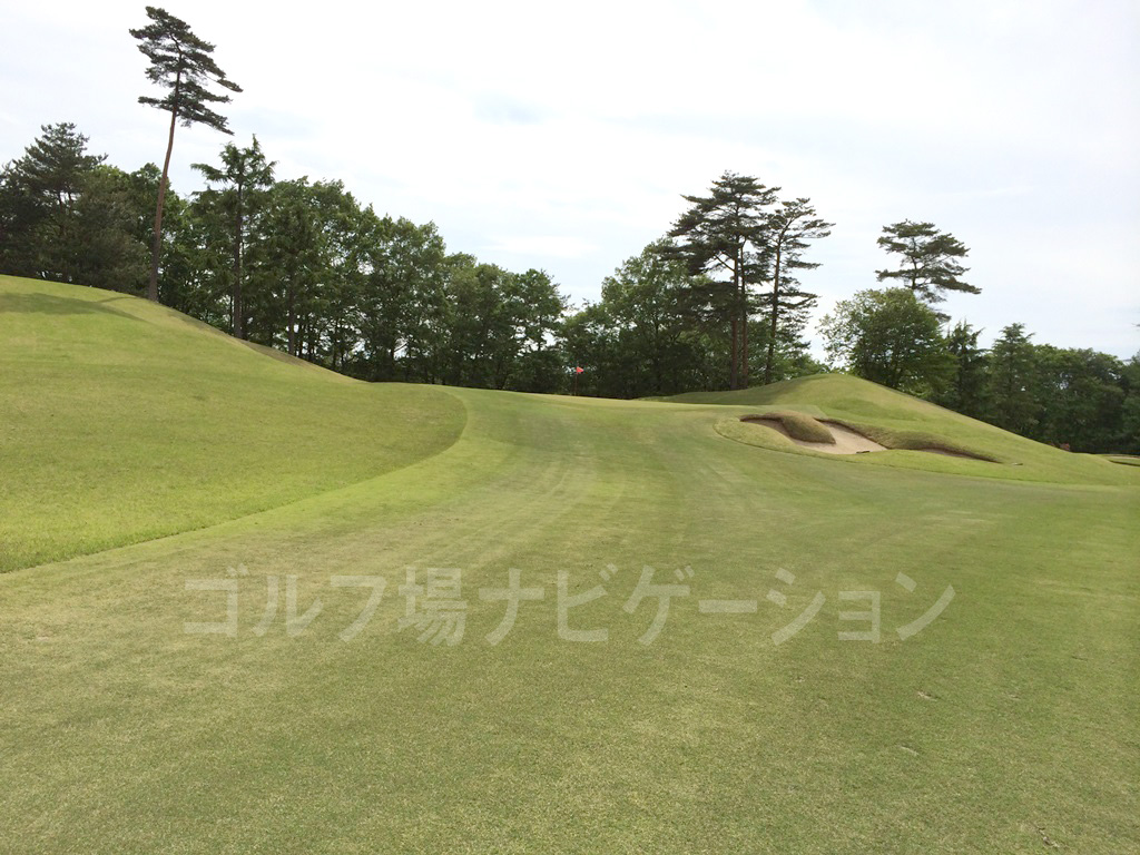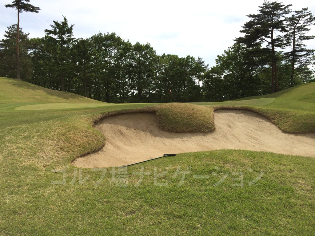 ほぼストレートでフラットなミドルホール。山吹ルートの場合はロングとなります。フェアウェイがバンカーで狭まっている。